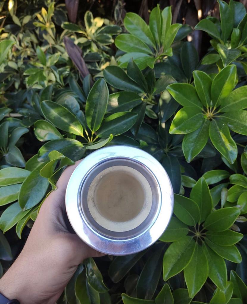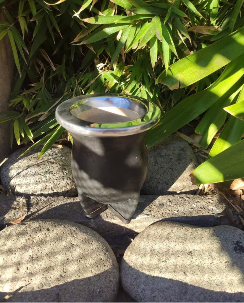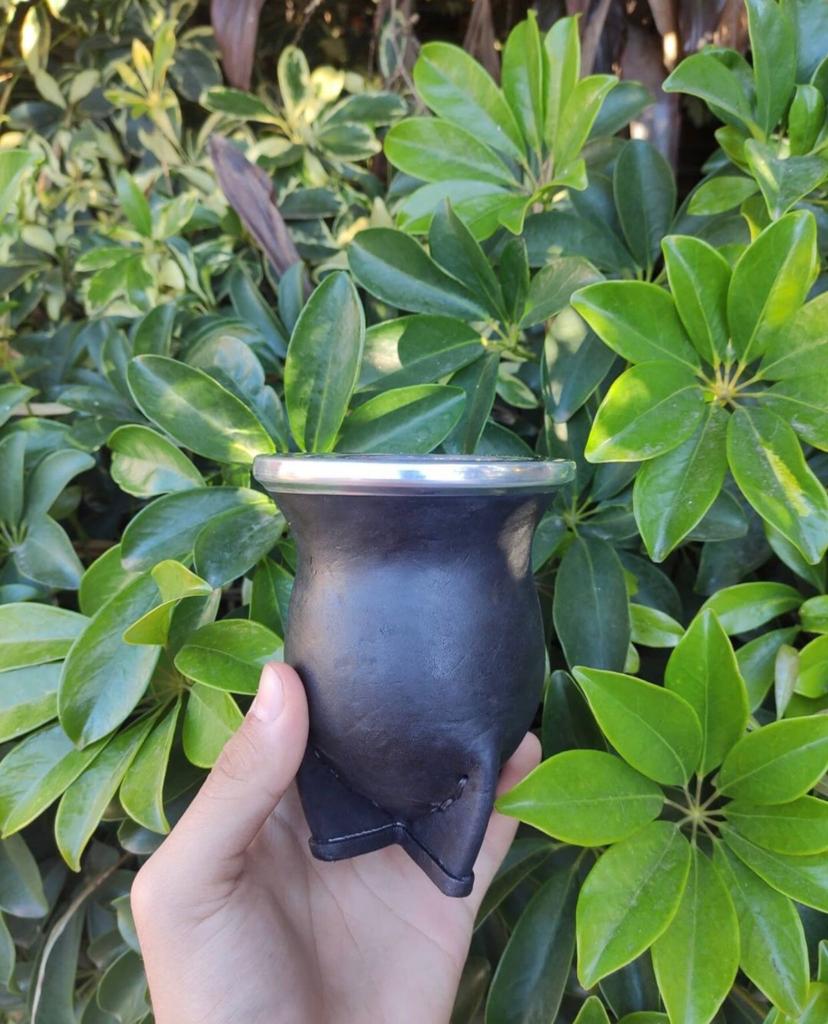 Mate camionero, interior de calabaza brasilera. Forrado en cuero, color negro, con la virola de acero inoxidable. Se puede grabar (Costo adicional)
